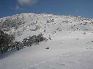 西熊山への登りは 直登の稜線通しの、冬道を利用。南面の雪はは 崩れ気味だ