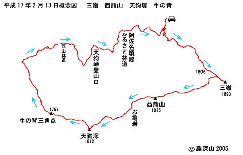 - 三嶺 西熊山 天狗塚 牛の背 いやしの温泉郷から周回>平成17年2月19日