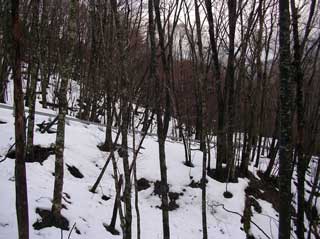 お亀岩へ 下って 天狗峠へ向けての 登りでは 雪が随分少なくなっている。