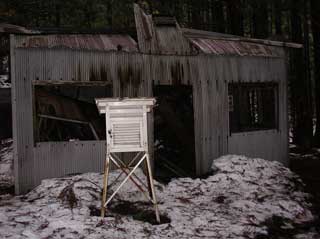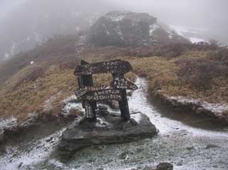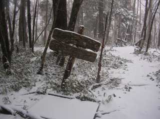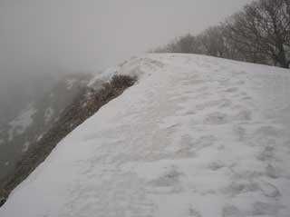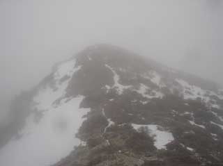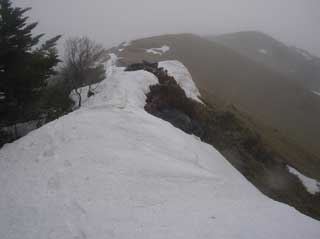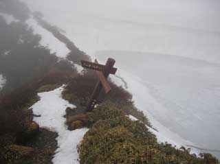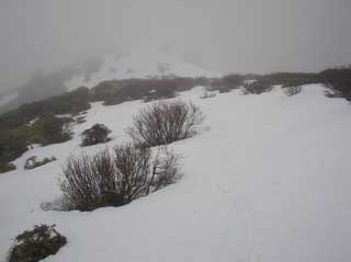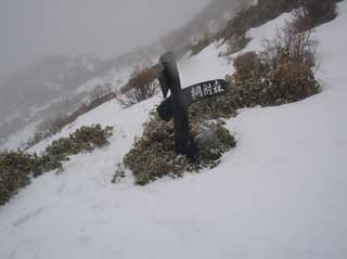 三嶺山頂 「マイナス2.3度 5m南風 雨 ガス 視界50-100m気温が高く 雪が腐っている」