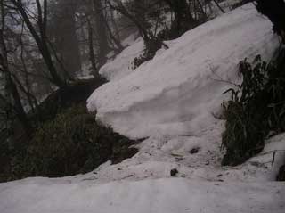 一端下ってから 三嶺ヒュッテにかけてのあたりは雪が深かった。