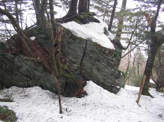 岩の上に樹木が立っているところからは、風と雨が強くなってきた。