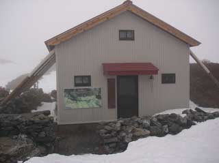 三嶺ヒュッテは 一月十六日玄関扉の下が雪に覆われていたが 今回は建物まわりの雪は 随分溶けている。