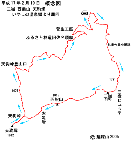 HOME > 山行記録 >積雪期 >三嶺 西熊山 天狗塚 牛の背 いやしの温泉郷から周回>平成17年2月19日