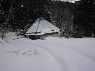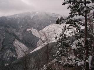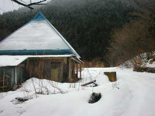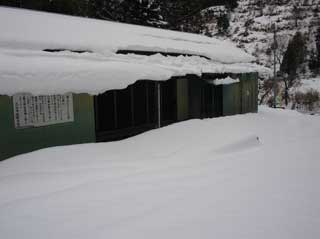 烏帽子山北面を見る 自然林の中の登り 倒木が多かった 三加茂東祖谷山線 深淵最奥の 民家 雪の重みで庇が崩れる 深淵集会所 桟敷峠付近 財産区の建物