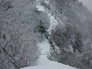 営林小屋から 取り付く。上へ行くにつれ 雪が多くなってくる。