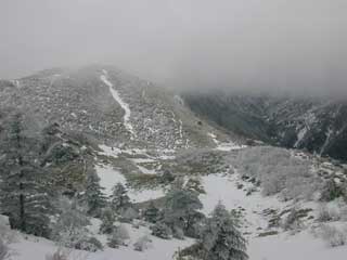 落合峠付近は北から風が抜けるためか 雪が飛ばされている。