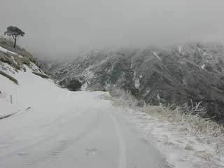伐採地が近づくと 天気は 曇り空から雪に変わり 山の上部はガスに覆われている。