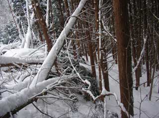 夏道と分かれた とたん 藪が ひどくなる。やがて 人工樹林帯へ 入るが 倒木が かなりあり ここも歩きにくい。