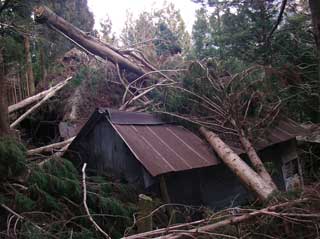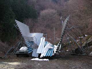 崩壊箇所を過ぎて しばらく行くと 工事車両の車庫が 大雪で押しつぶされていた。