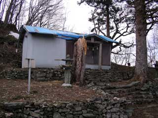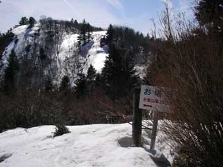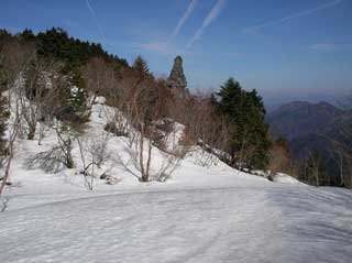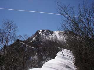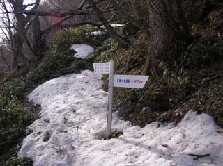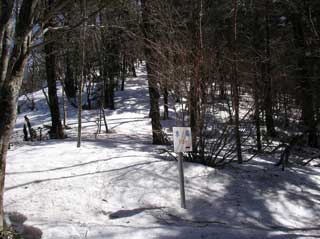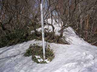 木の看板が新しい木地屋赤松線 平成15年より通行止め 大雪でつぶされた 車庫 今年は大雪? 樹林帯 木の回りに 春の兆しはない 樹林帯 縦走路に出る 矢筈山頂が見える ジェット機が飛ぶ 定点観測点 新雪を踏む 木々に 新雪 頂上直下 矢筈山頂 サガリハゲの向こうに