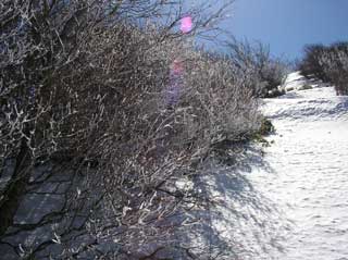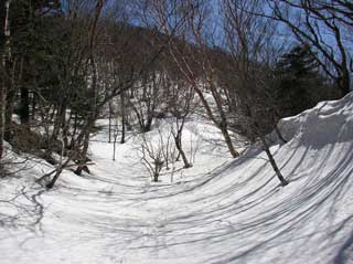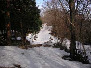 上部では木々の幹のまわりには 春先独特の 雪解けもまだ無いどころか、新雪が 更にうっすら積もっている。