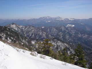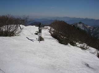 矢筈山頂 「プラス4.5度 7m 快晴 無風 絶好の眺望 剣山 次郎笈 高城山から 祖谷谷の向こうに三嶺 天狗塚 牛の背の北面が見える 西には 赤星山 赤石山系 笹ヶ峰なども遠望できる」