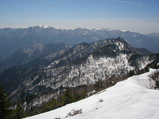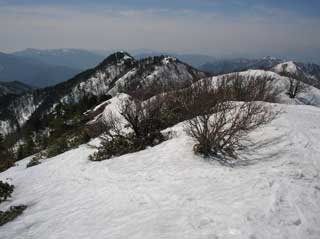 その向こうに 剣山 次郎笈矢筈山頂より 石堂山方面 矢筈山頂からの急な下り 例年遅くまで残雪が多く残る地点 石堂山 南 水場標識 石堂山山頂 石堂山 山頂東 五号標識 お塔石 お塔石標識 後は石堂山 石堂山からの下り 白滝山山頂 標識 石堂神社への下り 四号標識 三号標識 石堂神社への下り まだ雪が残る 新しいベンチ 石堂神社はブルーシート張り 木に押し倒される 廃屋 木地屋赤松線崩壊箇所