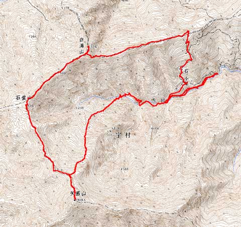 木地屋 駐車地点 7:24 --登山道入り口 7:43--徒渉地点 8:24--縦走路 10:53-- 矢筈山(11:20-12:54)--- 石堂山 14:01-- 白滝山15:00 --石堂神社 15:54 -- 木地屋駐車地点 16:53
