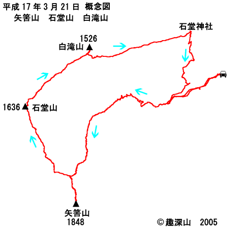 HOME > 山行記録 >積雪期 >矢筈山(1848)石堂山(1636)白滝山(1526)>平成17年3月21日