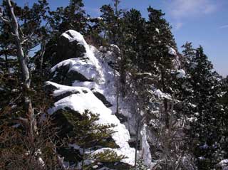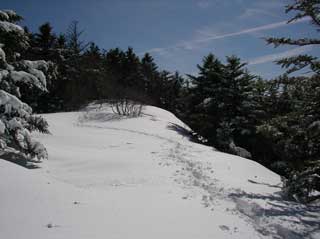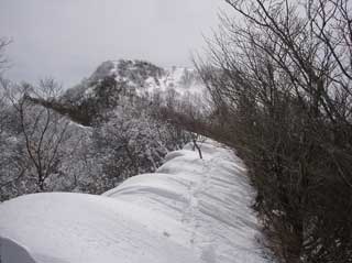途中 縦走路の岩峰のところは 積雪状況をみると 捲き道は特に 雪が深いため 稜線を忠実に直登コースを取る。こちらは雪が少ない。