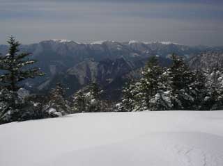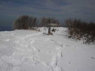 矢筈山頂 「マイナス1.3度 3-4m 北西風 晴れ 少し高い 雲が 出ている。 この時期には珍しい かなりの新雪。 21日のトレースなどすっかり無い。。 剣山 次郎笈 三嶺 天狗塚 などは見える 祖谷の谷も真っ白だ。」