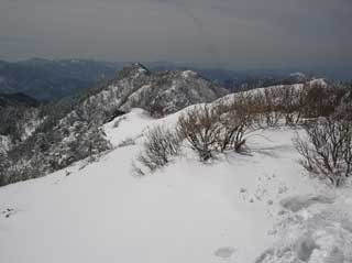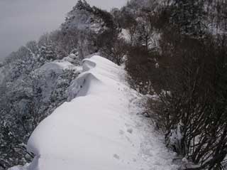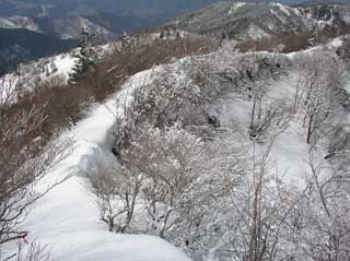 石堂山へ向けて縦走開始 急な雪面を 雪庇に注意しながら 下る。 雪が多い。