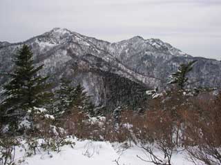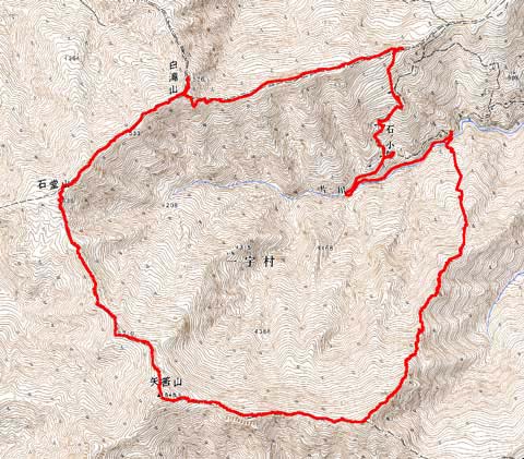 - 黒笠山(1703)矢筈山(1848)石堂山(1636)白滝山(1526) (2004年5月8日)無雪期の記録