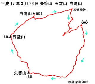 HOME > 山行記録 >積雪期 >矢筈山(1848)石堂山(1636)白滝山(1526)>平成17年3月26日
