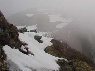 少し 三嶺側に 戻った地点から 西熊山北尾根を下降する。幅が広く 所々 広い残雪の雪田がある、