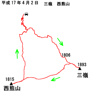 HOME > 山行記録 >積雪期 >残雪期>三嶺 西熊山 天狗塚 牛の背 >平成17年4月2日