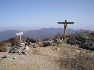 三嶺山頂 「9.2度 風1m 快晴 心地よい風だ。天狗塚 梶が森 綱附森 全て見える。 剣山は まだ遠い」