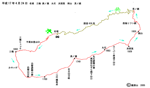 HOME > 山行記録 >無雪期> 三嶺(1893) 高の瀬(1741) 次郎笈(1929) 剣山(1955)> 平成17年4月24日