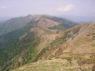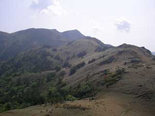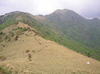 三嶺頂上から 急な坂を下り振り返ると 三嶺南面が しっかり見える。
