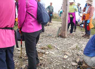 しかし どうやら 雷鳴は聞こえるものの 天候はとりあへず 大きな雷雲は ここには こないようで 何とかなりそうな感じであり、次郎笈山頂へ一頑張りすると、 薄い ガスのなか 剣山からピストン登山者で賑わう次郎笈山頂が見えてきた。