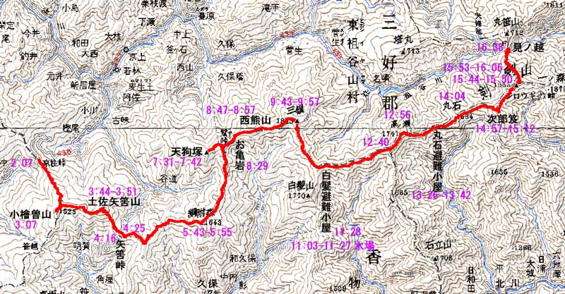 京柱峠 2:07 --- モミ千本標識 2:50 --- 縦走路京柱峠下山口分岐 3:02 --- 小檜曽山1524m三角点 3:07 --- 縦走路京柱峠下山口 3:12 --- 小檜曽山1541m標識 3:16 --- 土佐矢筈山山頂 ( 3:44-3:51 ) --- 矢筈峠土佐矢筈山登山口 4:16 --- 矢筈峠 水場 トイレ休憩( 4:17-4:20 ) --- 矢筈峠 綱附森登山口 4:25 --- 1421m標高点 4:55 -- 綱附森 ( 5:43-5:55 ) --- 堂床下山口 6:24 --- 天狗峠綱附森分岐 7:15 --- 天狗峠西山林道下山分岐 7:19 --- 天狗塚 ( 7:31-7:42 ) -- 天狗峠 綱附森分岐 7:57 --- 水場 ( 7:59-8:17 )[水くみで 縦走路からはずれている時間] --- お亀岩 8:29 --- 西熊山 ( 8:47-8:57 ) ---三嶺 ( 9:43-9:57 ) -- カヤハゲ 10:25 --- さおりが原分岐10:30 --- 白髪分岐 10:58 --- 水場( 11:03-11:27 )[水くみで 縦走路からはずれている時間] --- 白髪避難小屋 11:28 --- 1700m三角点 11:49 --- 1732m標高点 ( 12:07-12:19 ) --- 石立山分岐標識地点 12:40 --- 高ノ瀬 山頂 12:56---丸石避難小屋 ( 13:26-13:42 )--丸石 14:04---次郎笈山頂 ( 14:57-15:12 )---剣山山頂 三角点 ( 15:44-15:50 )---剣山頂ヒュッテ ( 15:53-16:06 ) --- 西島リフト駅 ( 16:18-16:22 ) -- 剣神社 16:36 --- 見ノ越 第一駐車場 16:38