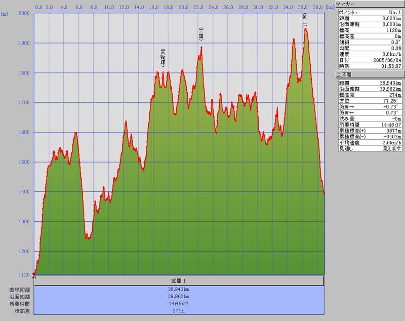 累計歩行距離 39.962km 累計標高差 3677 m