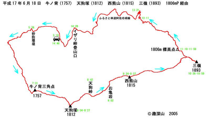 西山林道駐車地点 5:28 ---砂防堰堤 5:46-- 牛の背三角点 (7:49-7:58) --- 天狗塚山頂 (8:34-8:57) -- 天狗峠西山林道下山口 9:13 --天狗峠綱附森分岐 9:17 --- お亀岩 9:32 -- 西熊山 (9:52-10:09) -- 三嶺 (11:09-11:42) --1806標高点 (11:58-12:04) --- ふるさと林道13:24 --西山林道天狗峠登山口14:16 --砂防堰堤14:49 -----西山林道駐車地点 15:05