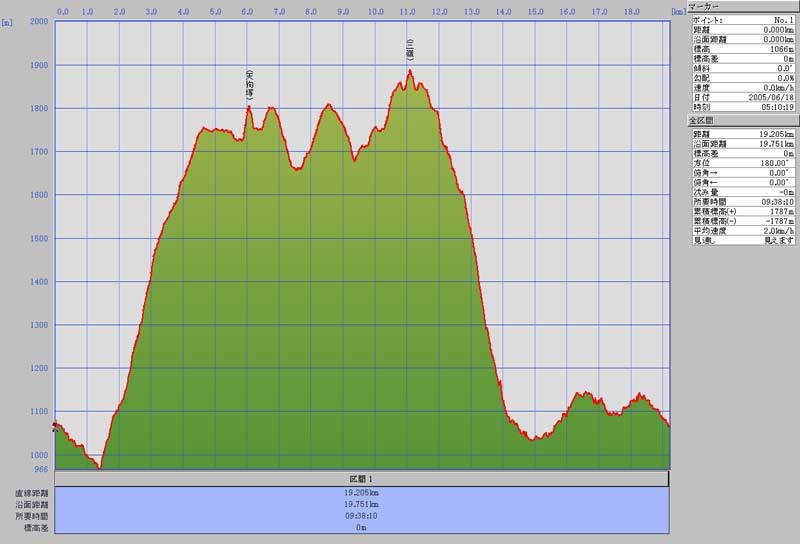 累計歩行距離 23.494km 累計標高差 2196m平成18年7月1日 曇 時々 雨