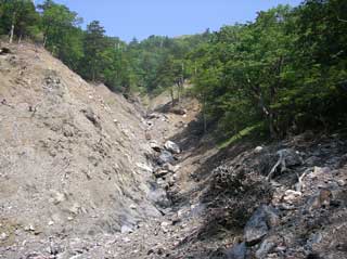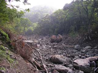堆積した土砂も 下の方は 流れて しまったようだが 、フスベヨリ谷の沢沿いに登るにつれ 土石流の堆積した土砂が増えてくる。