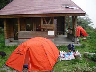 お亀岩避難小屋は宿泊の方もいたが 小屋の前には テントが2張り 張られていた。