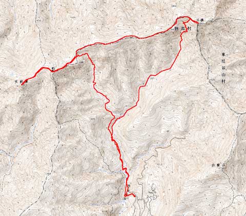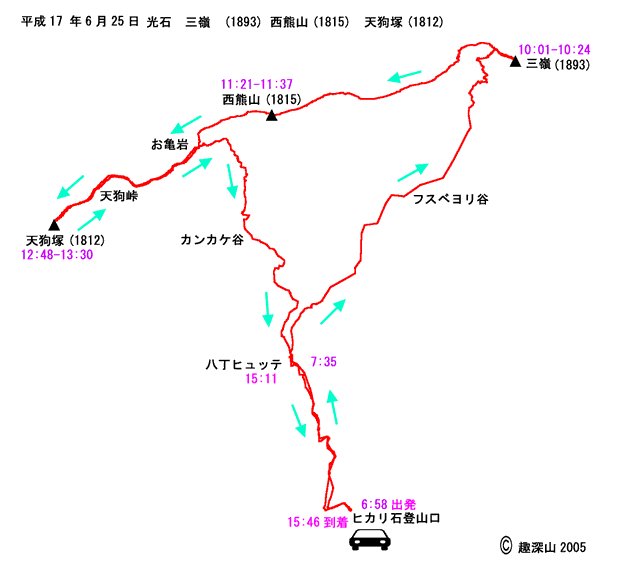 光石登山口 6:58 -- 八丁ヒュッテ 7:35 ---三嶺山頂 (10:01-10:224) -- 西熊山 (11:21-11:37) ---お亀岩 11:55 --- 天狗峠 12:32 --- 天狗塚山頂(12:48-13:30)-- 天狗峠 13:22 -- お亀岩 14:05 ---八丁ヒュッテ 15:11 --- 光石登山口 15:46