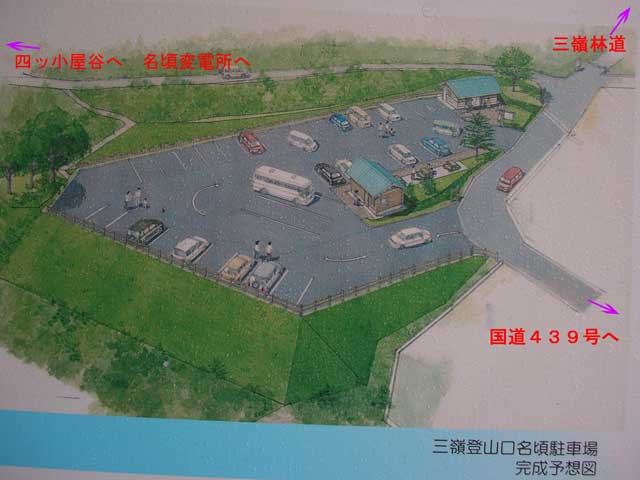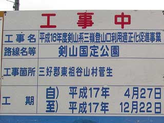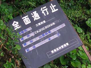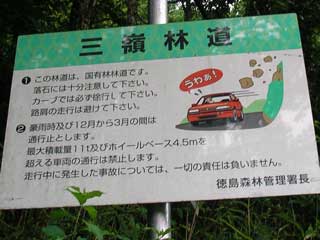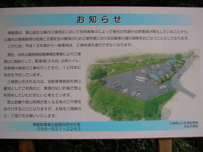 三嶺林道入り口の看板には「お知らせ徳島県は、剣山国定公園の三嶺地区において利用者集中によって植生の荒廃や自然環境が悪化していることから、公園内の環境負荷の提言と交通安全の確保のため三嶺林道における自動車の通行規制をおこなうこととしています。このため平成18年春から一般車両は三嶺林道を通行できなくなります。現在、自然公園等施設整備補助事業により三嶺登山口施設として、駐車場(34台)、公衆トイレ、休憩案内施設の工事を行っており、12月末に完成を予定しています。三嶺登山をされる方は、当駐車施設を登山基地としてご利用の上、無理のない計画で登山利用をしていただきたいと考えています。登山距離や登山時間が長くなる等のご不便をおかけすることになりますが、主旨をご理解の上、ご協力をお願いします。徳島県環境企画課自然共生室 088-621-2263 」