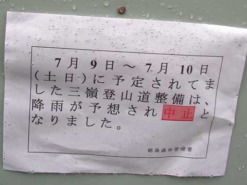 この日 徳島森林管理署の登山道整備が 予定されていたが 雨で中止された。