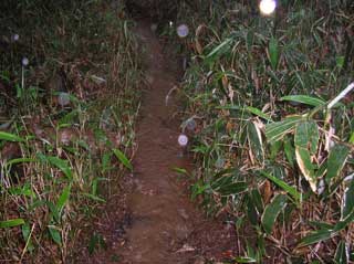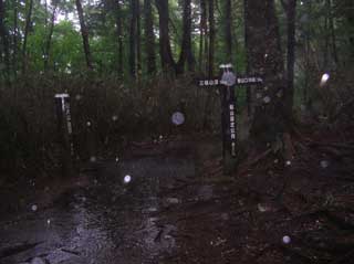 登山口から山道にはいると 雨あしが強くなってきた。ダケモミの丘からの 登山道は 勢いよく水流が流れ 小川になっている。水たまりも大きく広がっている。