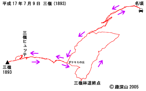 名頃 9:06 -- 登山口 9:38 ---ダケモミの丘 10:39 ---三嶺山頂 (11:45-11:56) --三嶺ヒュッテ (12:06-12:50) ---ダケモミの丘 13:36---三嶺林道終点 13:58--- 名頃 15:39