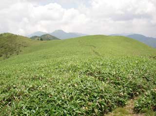 登山道を覆うササの朝露をかき分ける時 水滴でビッショリとなるが、日差しがでてきて 朝露は 急速に減っていく 。
