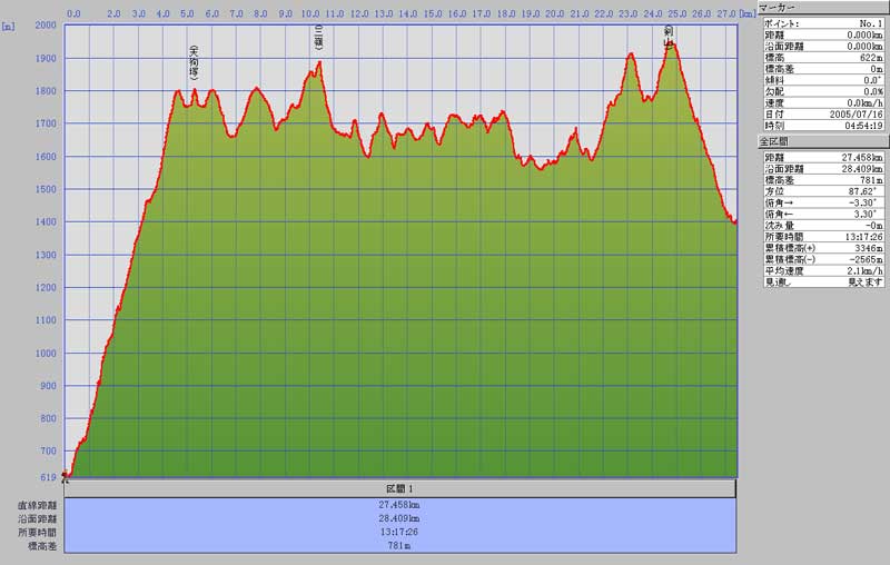 【etrex-legend-J で計測】 累計沿面歩行距離 28.409km 累積標高差 +3346m