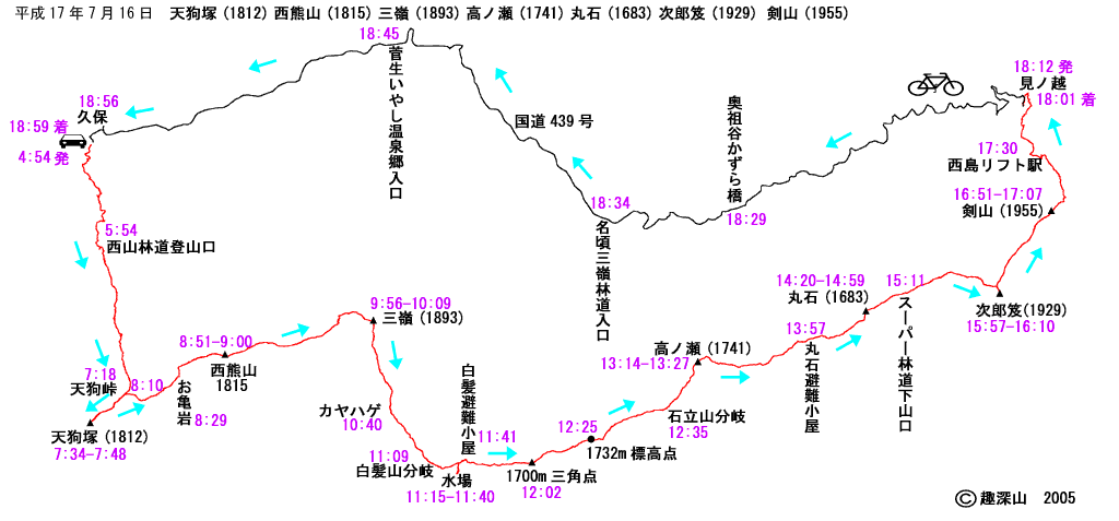 久保 駐車地点 4:54 --西山林道登山口 5:54 -- 1476標高点 6:32 --天狗峠 7:18 -- 天狗塚 (7:34 -7::48) --天狗峠 8:10 -- お亀岩 8:29 -- 西熊山 ( 8:51-9:00) -- 三嶺(9:56-10:09) ---カヤハゲ 10:40 --白髪山分岐 11:09 --水場 ( 11:15-11:40 )--白髪避難小屋 11:41 -- 1700m三等三角点 12:02 --1732m標高点 12:25--石立山分岐 12:55--高の瀬三角点 (13:14 - 13:27 ) --丸石避難小屋 13:57 -- 丸石 (14:20-14:59) --スーパー林道分岐 15:11-- 次郎笈 (15:57-16:10) -- 剣山 ( 16:51-17:07 ) -- 見越 18:01