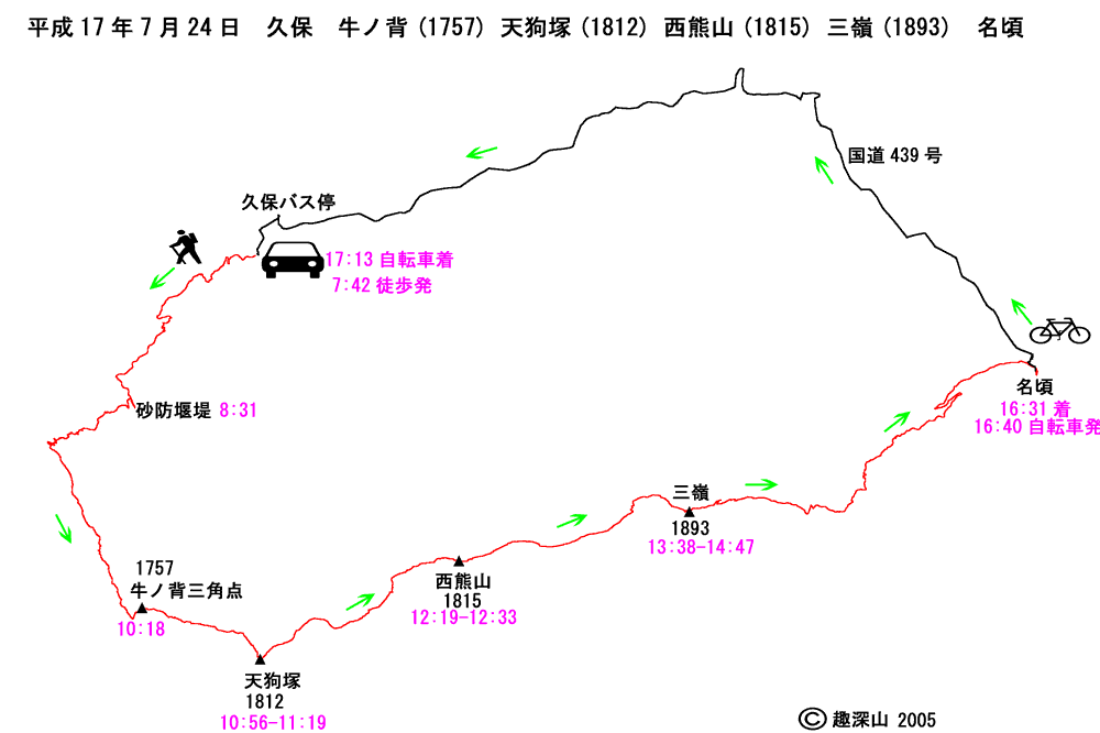 久保 7:42 --砂防堰堤 8:31 -- 牛の背三角点 10:18 --- 天狗塚山頂 (10:56-11:19) -- 天狗峠(西山林道下山口) 11:34 -- お亀岩 11:56 -- 西熊山 (12:19-12:33) -- 三嶺 (13:38-14:47) --平尾谷登山口 15:59 -- 名頃 16:31