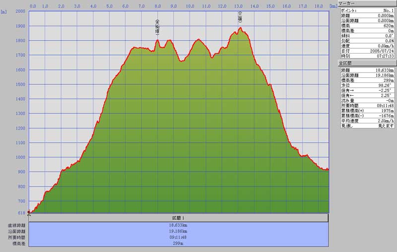 累計歩行距離 19.186km 累計標高差 1975m
