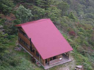 お亀岩避難小屋の 台風で被災した屋根修理は 完了し 修理した屋根の塗装塗り替えが完了していた。