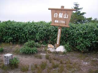 綱附森 山頂 「17.3度 3-4m 西風 曇り 心地よい風だ。 対岸に 白髪山が見えるが三嶺 天狗塚はガスで見えない 。」