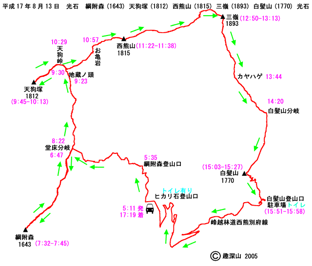 HOME > 山行記録 >光石 綱附森(1643) 天狗塚(1812) 西熊山(1815) 三嶺(1893) 白髪山(1770) 光石 > 平成17年8月13日